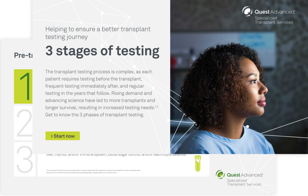 Each transplant recipient requires frequent monthly testing, both before their transplant and long after, resulting in a complex and lengthy testing journey. As the number of transplant recipients continues to increase and advancing science enables improved survival rates, this process will only get longer and more complex. Here we break down the journey by stages.